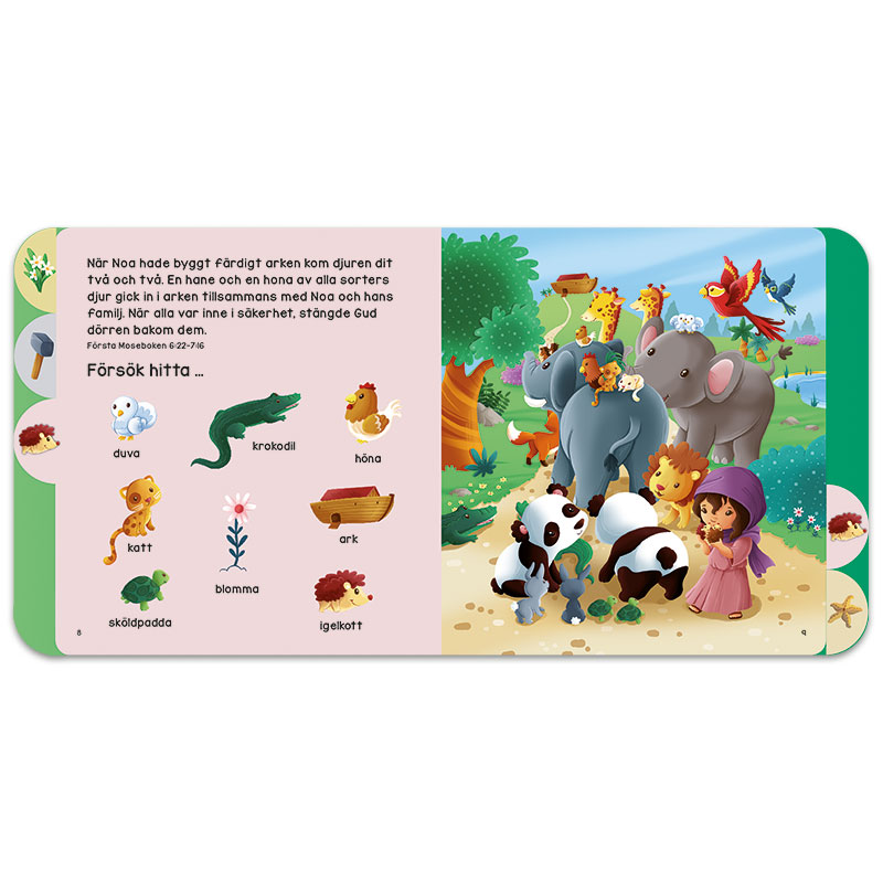 Flikarna på varje kartongblad hjälper små fingrar att vända blad medan de lyssnar till den lättlästa bibelberättelsen.