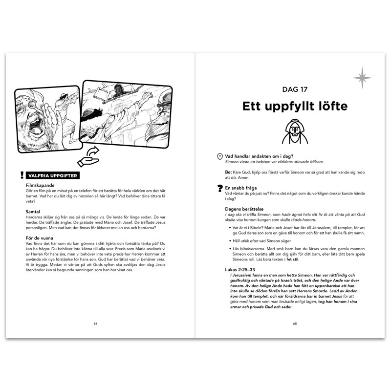 Den här boken består av 24 färdiga adventsandakter med frågor för varje åldersgrupp, från små barn till tonåringar och vuxna. Varje andakt tar mindre än 10 minuter. Missar ni en andakt så fortsätter ni bara där ni var nästa gång. Gör som det passar er familj, för alla familjer är olika!