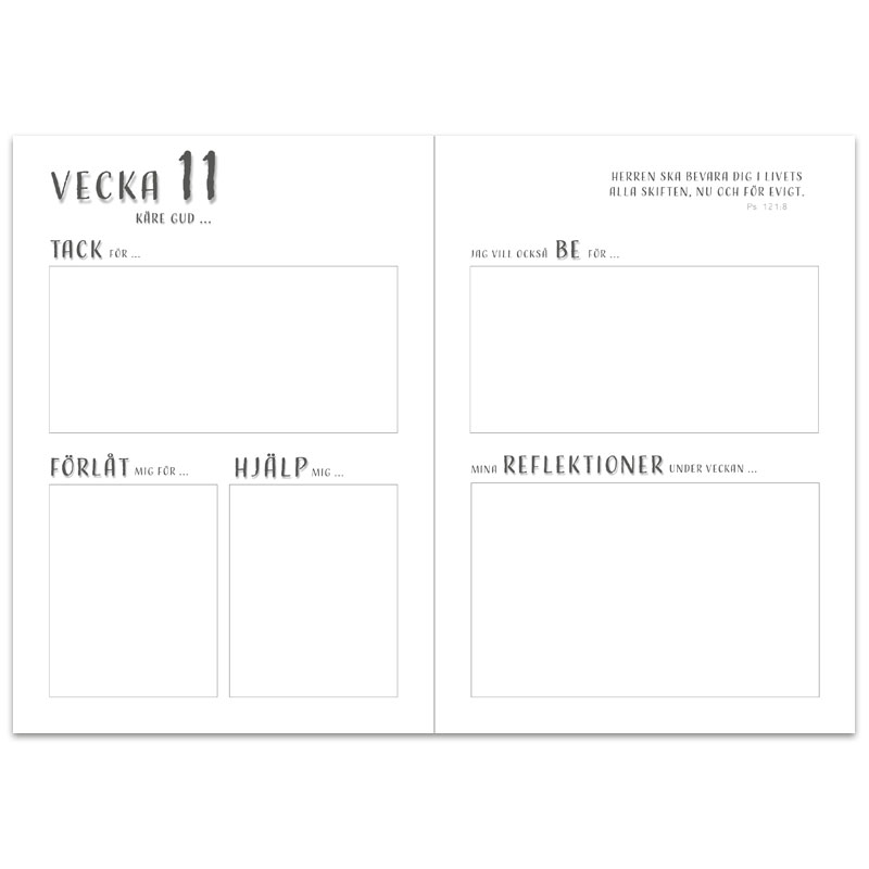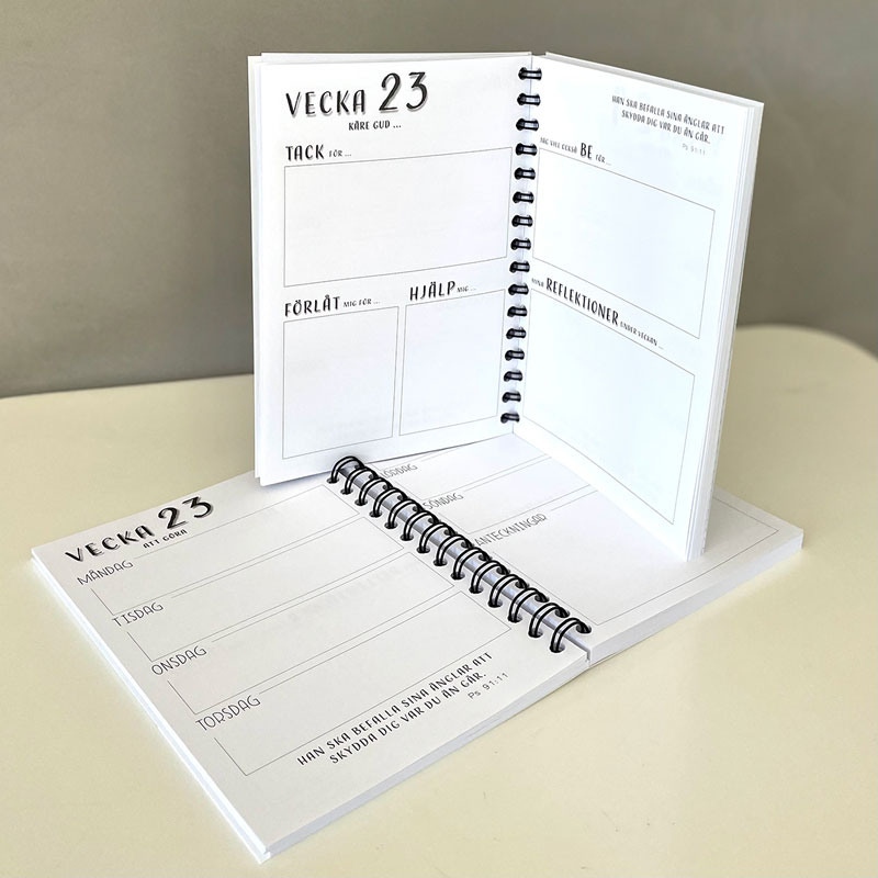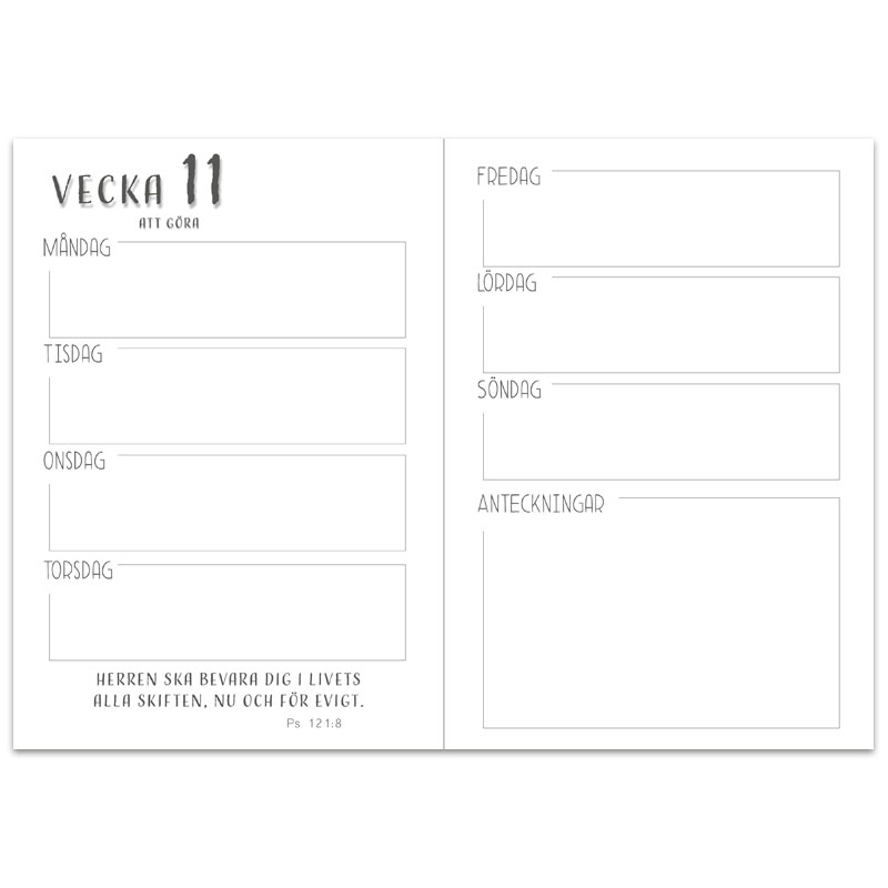 Varje vecka består av två uppslag som ger dig plats för planering men även för bön och reflektion. Du får en god överblick av din tid och kan på ett tydligt sätt följa förändring och utveckling.