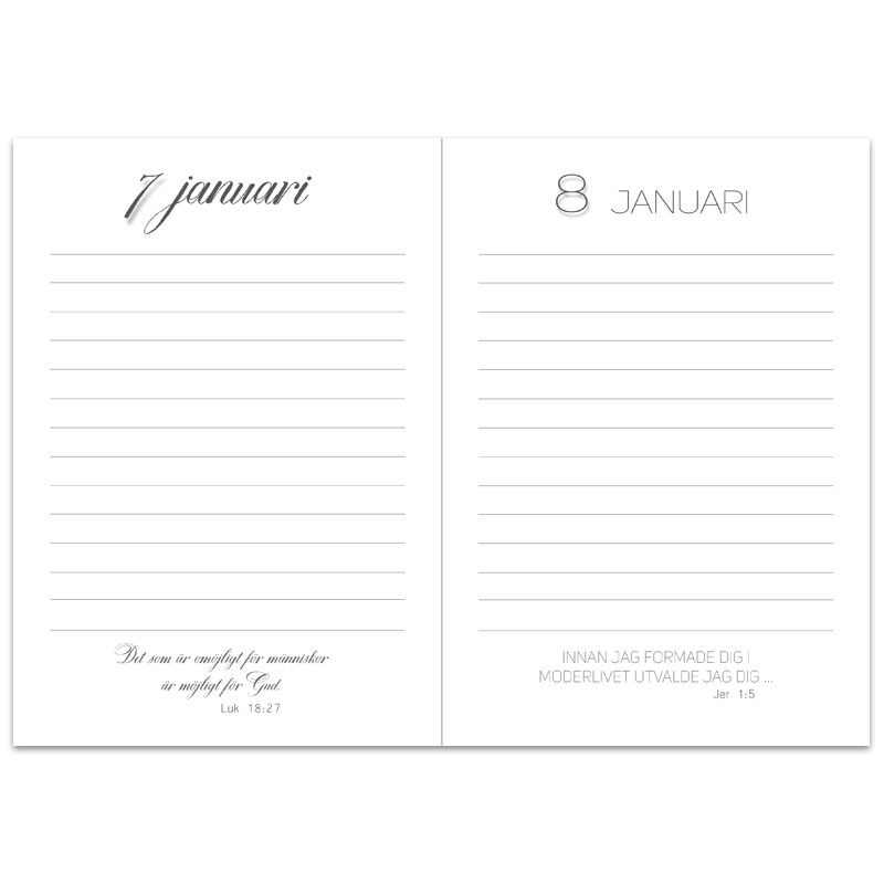 En bok för planering och egna tankar. Denna dagbokskalender kan du använda precis som du vill. Varje datum fyller en hel sida och därför har du mycket utrymme för anteckningar och funderingar.